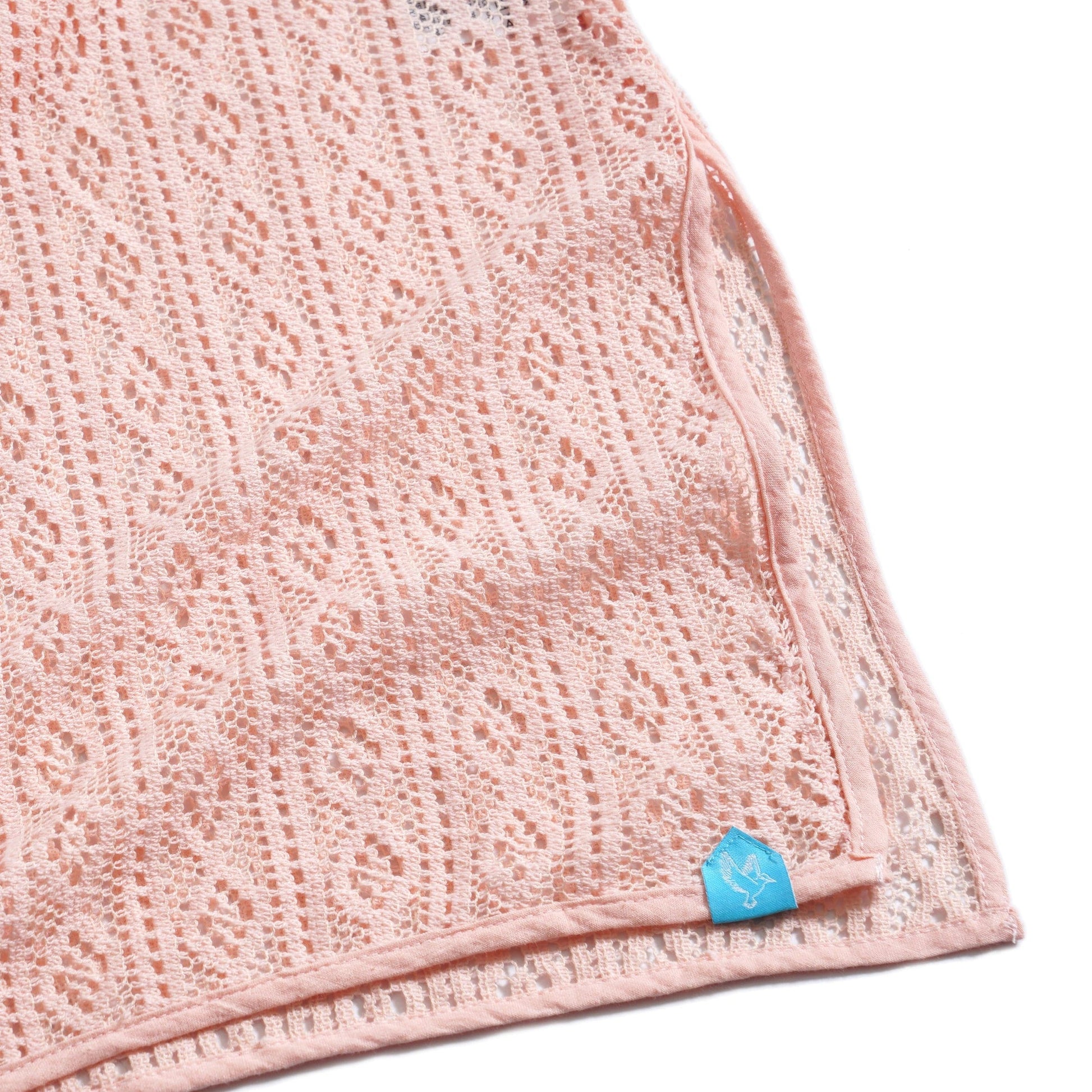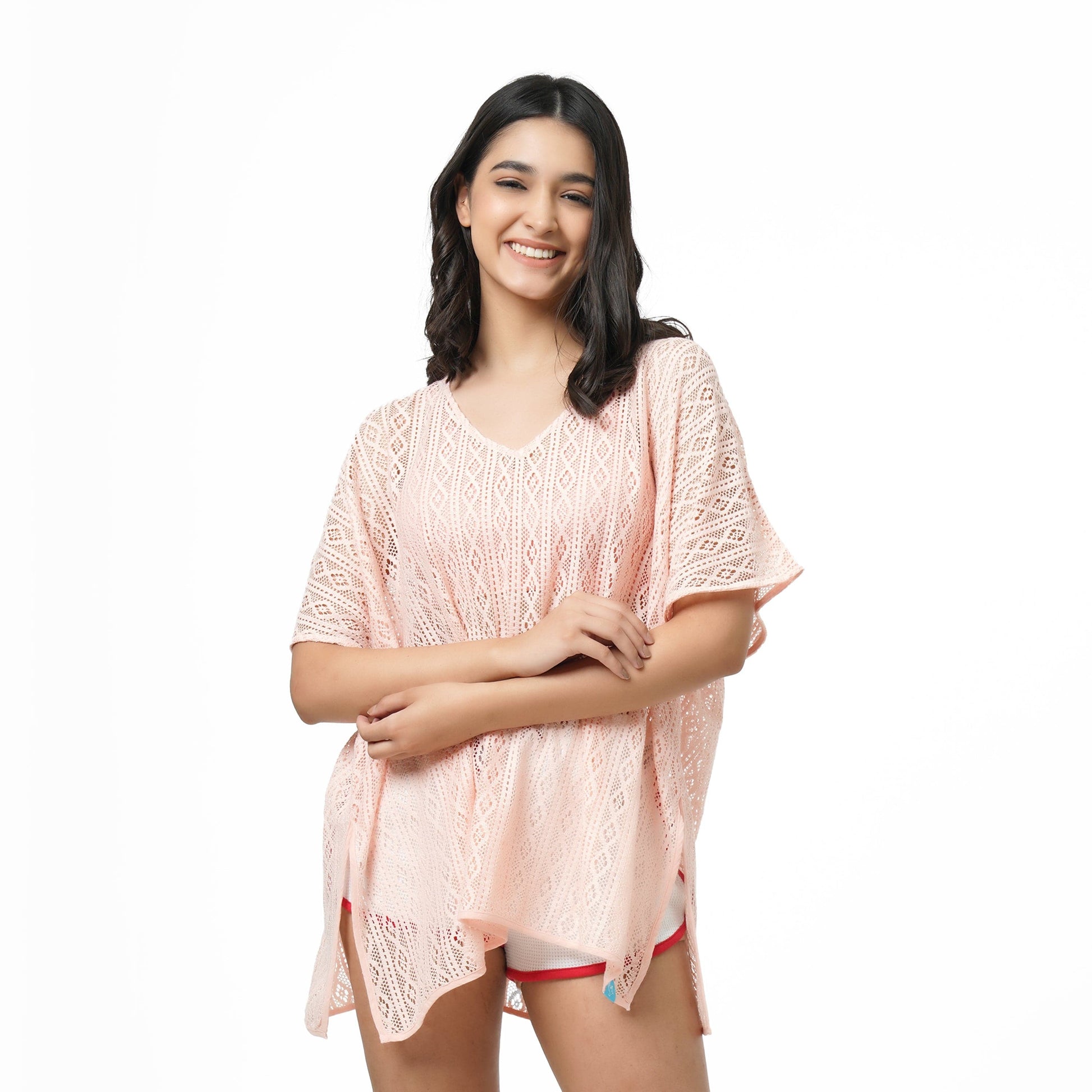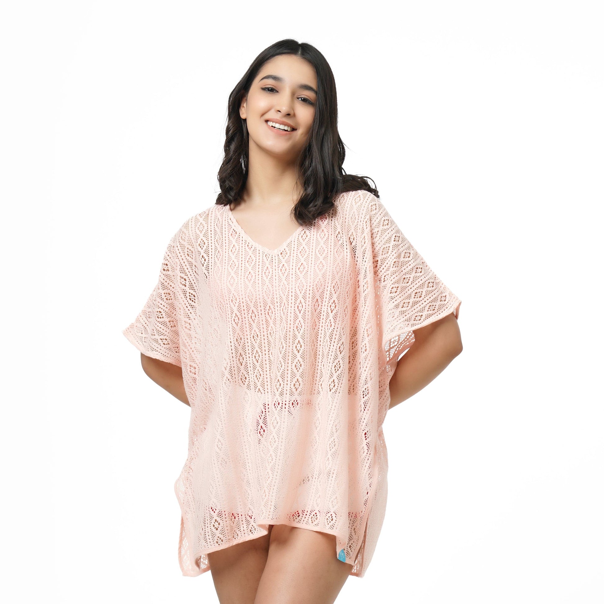 Lace coverup kaftan top in pastel pink colour. One size fits all. Very versatile whether lounging by the pool or strolling along the beach this kaftan ensures your are always in style.